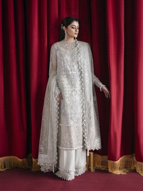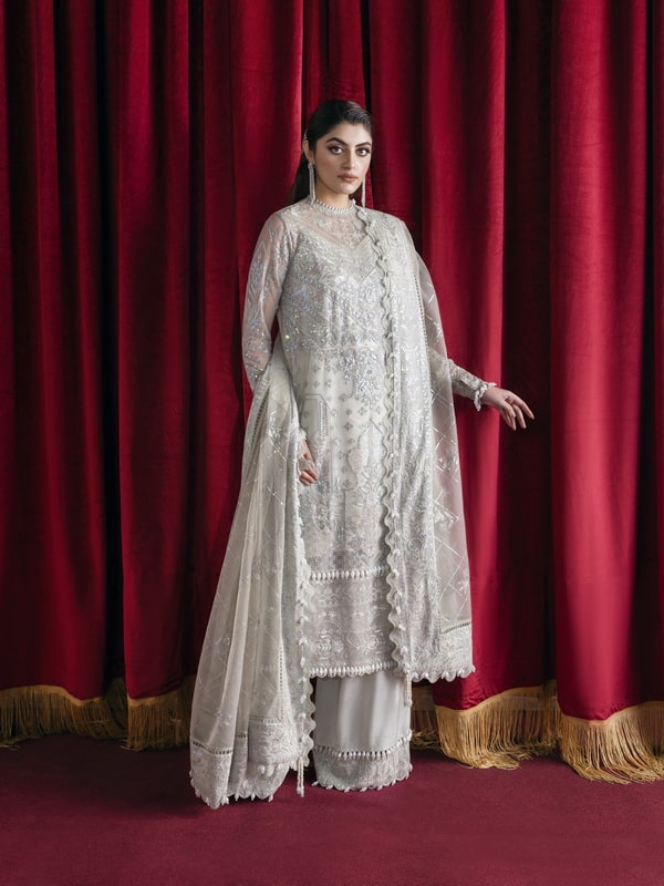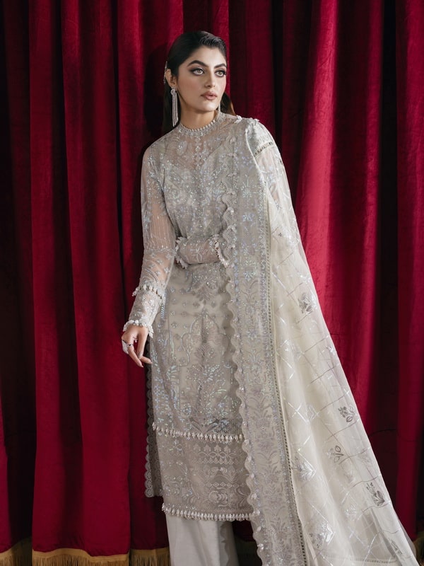 - Description: This Aqua-Colored Net Outfit Is A Stunning Piece. The Intricate Embroidery Adds An Element Of Glamour And Sophistication To The Dress. While The Lightweight Net Fabric Creates A Beautiful Flowy Appearance. Paired With An Embroidered Organza Dupatta That Has A Four-sided Embroidered Border, This Ensemble Is The Perfect Choice For A Formal Event Or Wedding. The Subtle Aqua Color Adds A Touch Of Understated Elegance To The Overall Look.