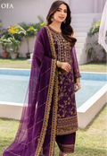 Flaunting her captivating charm Saboor Aly wins hearts dressed in this fetching purple attire. A heavily embroidered shirt decked with antique gold two-toned zari & sequins is worked in a seamless pattern all over the shirt, it is further accentuated with a neckline & borders completing the look. Delicately worked chiffon dupatta co-ordinates perfectly with the shirt & trouser.