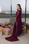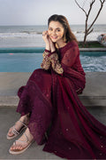 'Carnelian' is created on a burgundy chiffon fabric with sequin embellishments and exquisite artistry done on the neckline and sleeves with delicate embellishments of Kora, dabka, and Pearls to make this attire more pleasing. Paired with an enigmatic embroidered chiffon dupatta with apart of sequins all over it and raw silk trousers. To lighten up the outfit even more, pair this beautiful festive attire with trendy jewelry pieces.