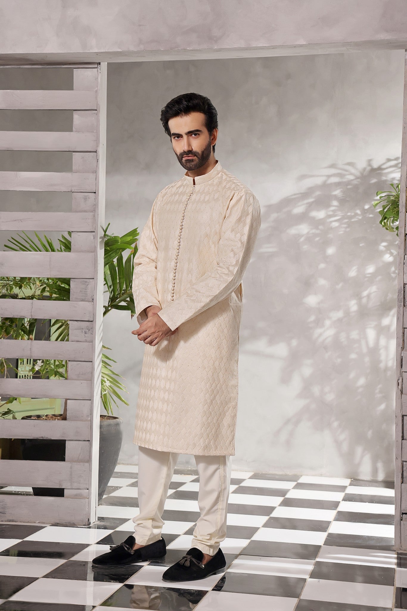 Men's Fancy Kurta Pyjama on Jamawar Fabric with Chikan Embroidery