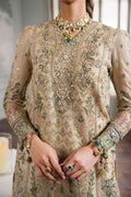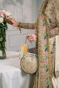 A 3-piece skin coloured ensemble featuring a shirt embellished with gleaming handwork on its neckline. The zari work lightens the masuri fabric, enhancing the luxuriousness this dress offers. Fancy laces and tilla utter the essence of grandiosity. The blend of subtle hues seamlessly creates a flow of serenity. The embroidered digitally printed chiffon dupatta and dyed silk trouser accompany the shirt. It's the answer to all your festive calls. Stitched or unstitched? It's up to you. If stitched, a short shirt with gharara or a long shirt with loose trousers? Again, your choice.