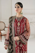 The entrancing red 3-piece ensemble featuring an elegant shirt with iridescent embroidery on its front, back and sleeves. The border and sleeves are embellished with alluring velvet embroidery. A deep contrast of red shirt and green dupatta resonates an enchanting fusion of splendour and majesty. The dupatta is ornated with ravishing embroidery and a blend of velvet grandeur. The embroidered silk trouser accompanies the resplendent duo. So, you can go for unstitched or stitched. Ultimately, you get to decide between a long or a short shirt, if you're vouching for stitched option.