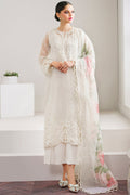 The EMBROIDERED ORGANZA UF-526 features a beautifully embroidered front and neckline patch, a plain organza back, and a delicate embroidered border along the front and sleeve edges. It also includes a digital printed organza dupatta with intricate embroidery and a dyed silk trouser for a complete and elegant outfit.