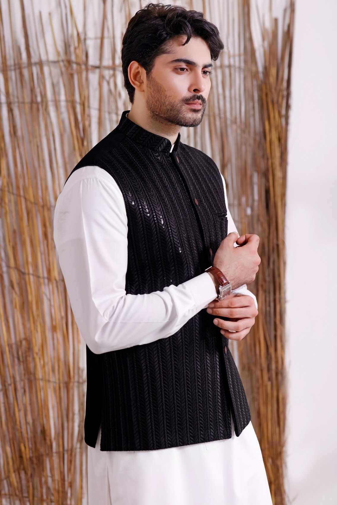 Men's Formal Waistcoat with Suit on Black Rib with Sequence Embroidery.