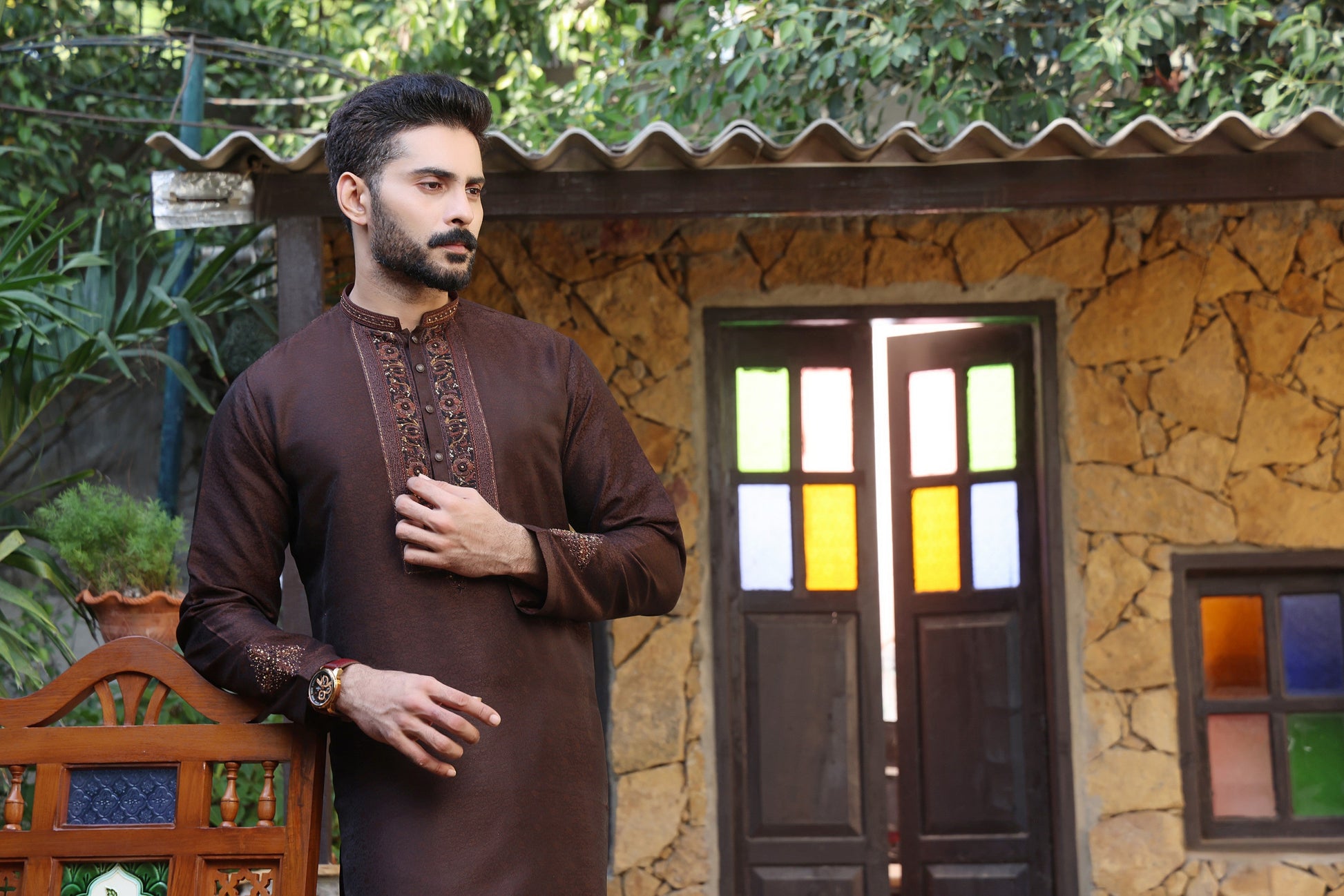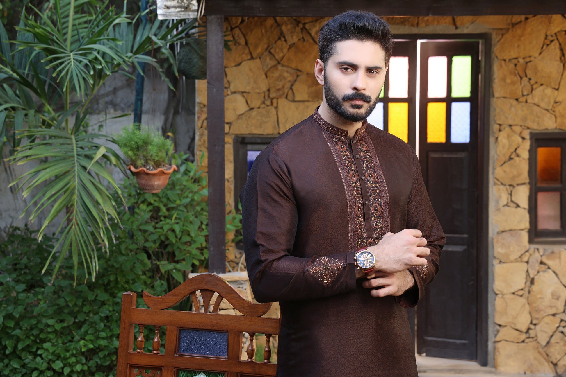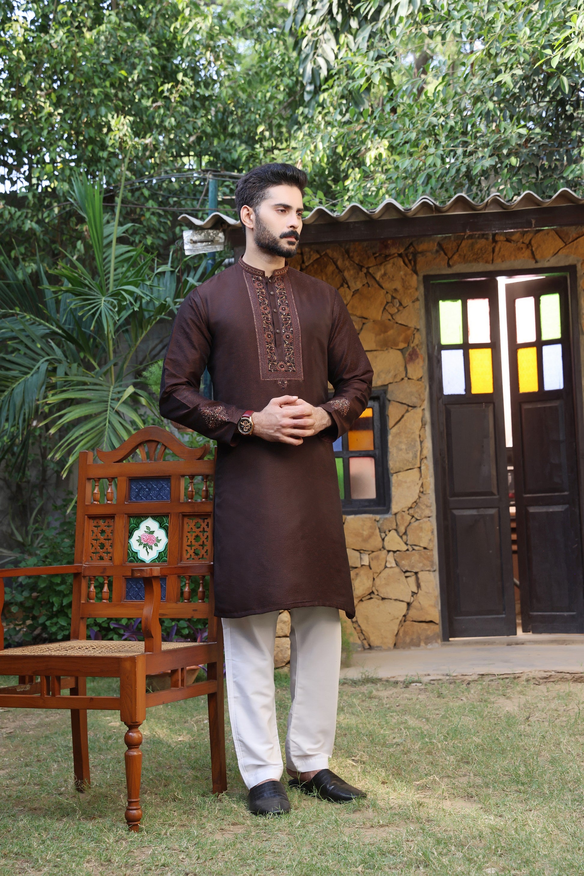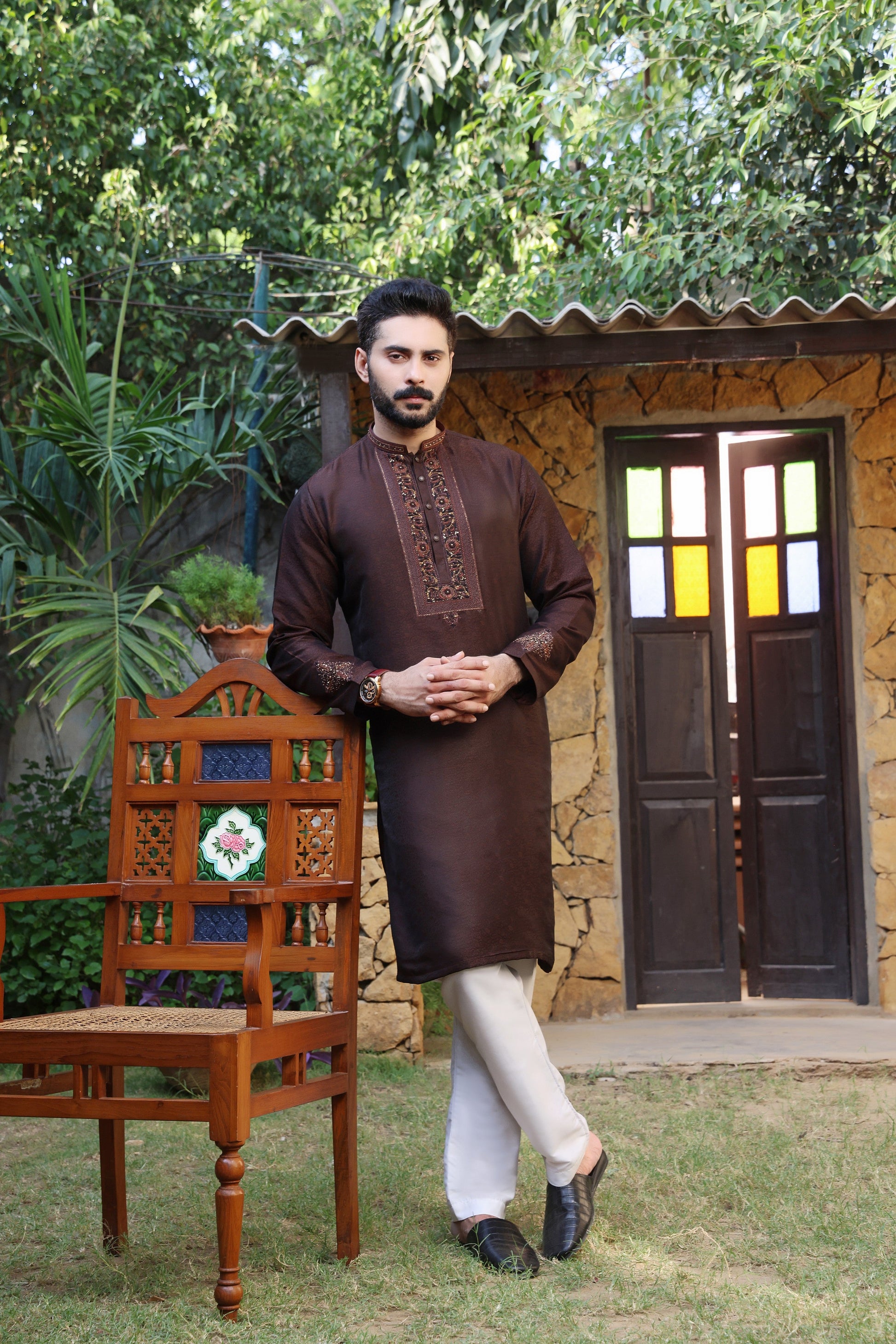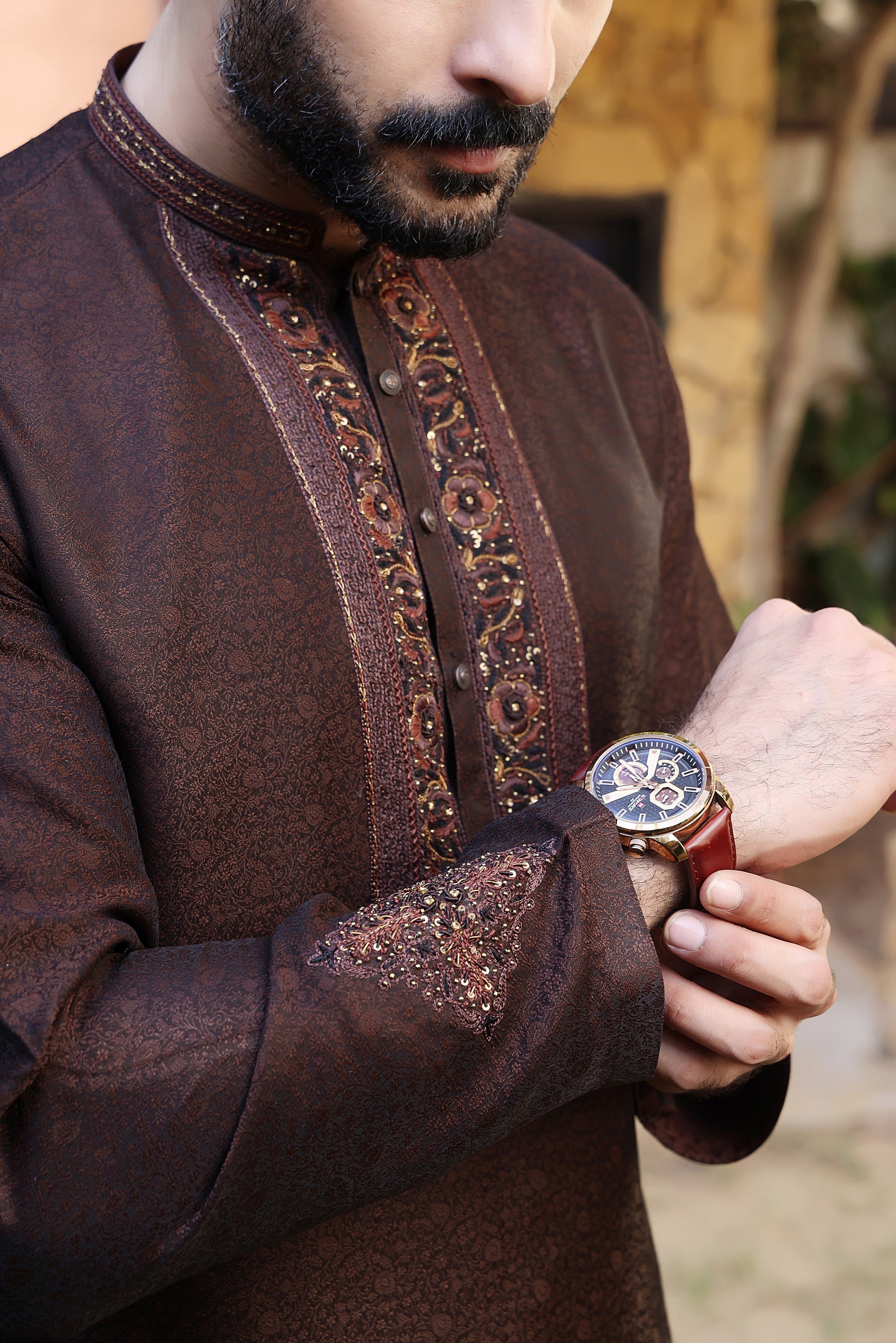 Men's Formal Jamawar Kurta with Self Texture and Handwork along with Off White Pyjama
