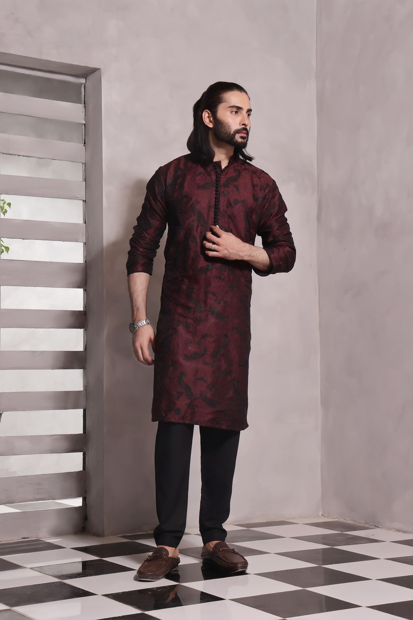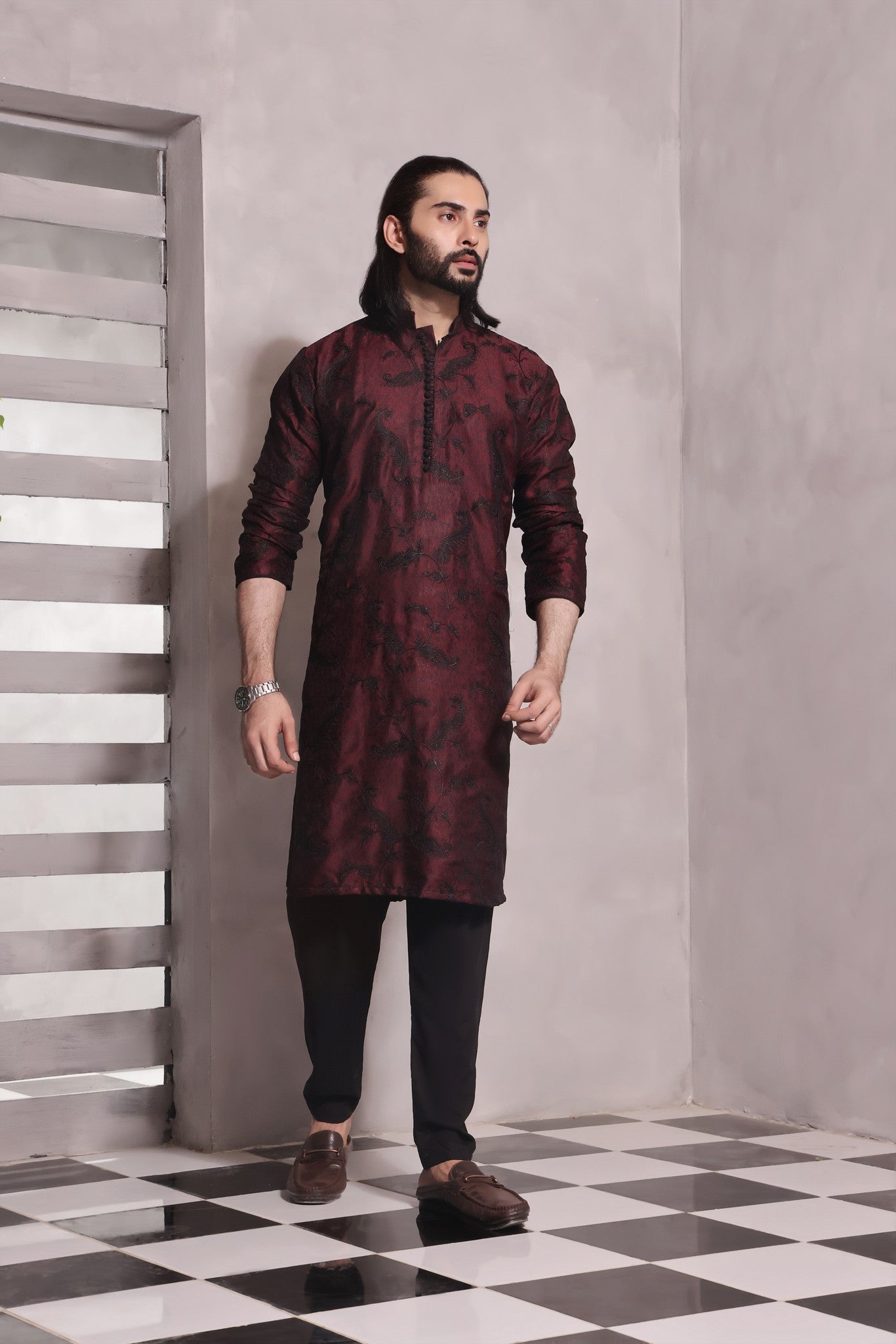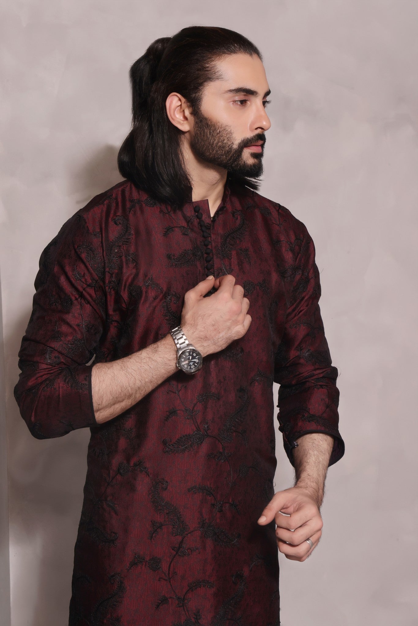 Men's Fancy Kurta Pyjama on Jamawar Fabric with Chikan Embroidery