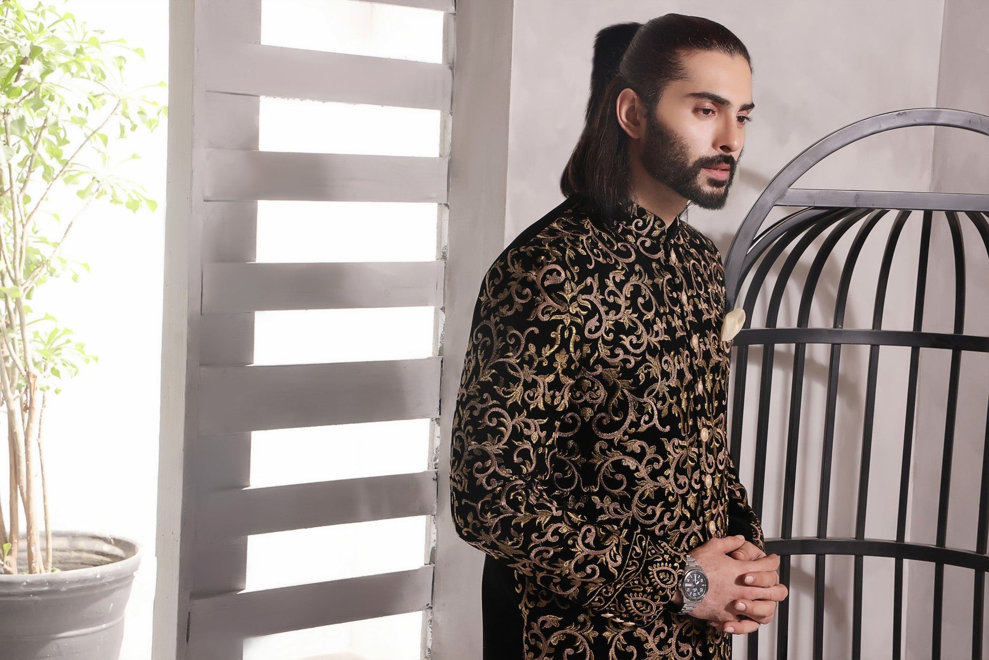 Men's Formal Velvet Sherwani with Computer Embroidery and Pyjama along with it