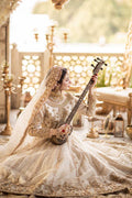 A timeless article consisting of pure organza Peshwas and dupatta paired with Raw Silk lehenga is heavily embellished with antique gold hand tilla, zarri, dabka, pearl and sequence work.