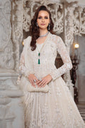The dreamy White on White front open gown with delicate 3 D floral designed patterns and hand placed sequins, pearls, crystals combined with meticulously composed embroidered sleeves with cut work details and frilled edgings along with a peeping through tulle based ruffled lehnga.