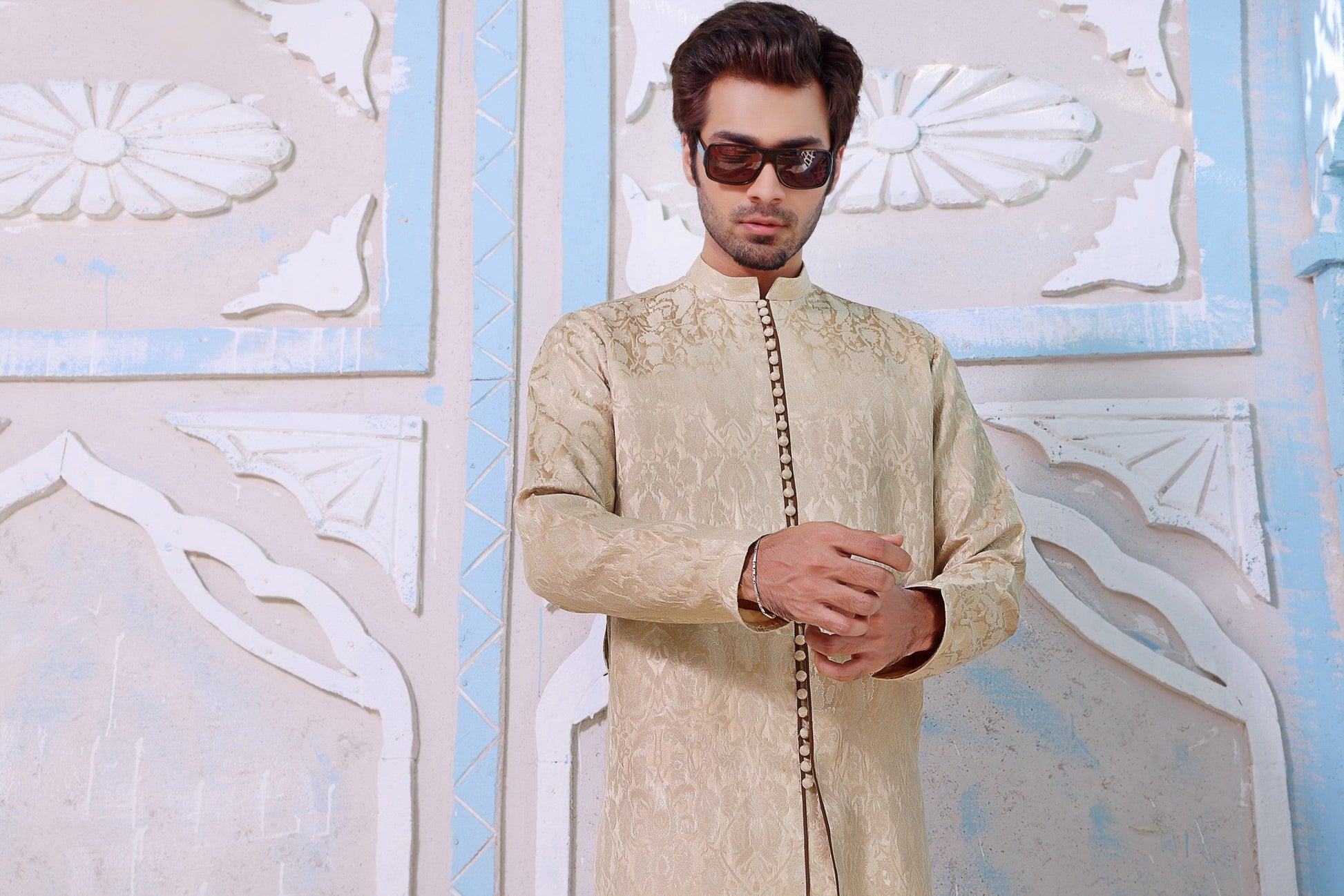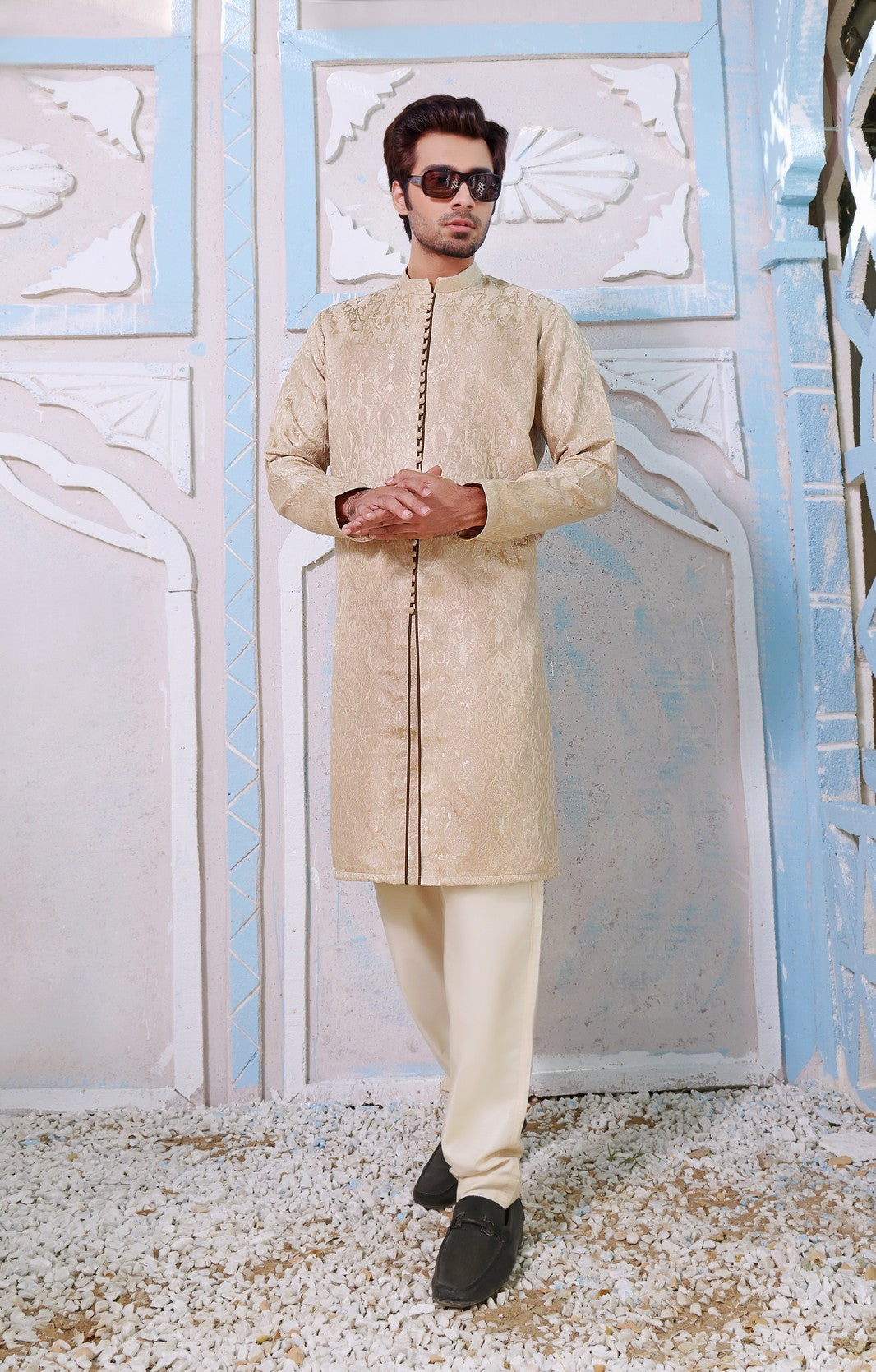 Men's Front Open Kurta Pyjama on Jamawar Fabric with Embroidery