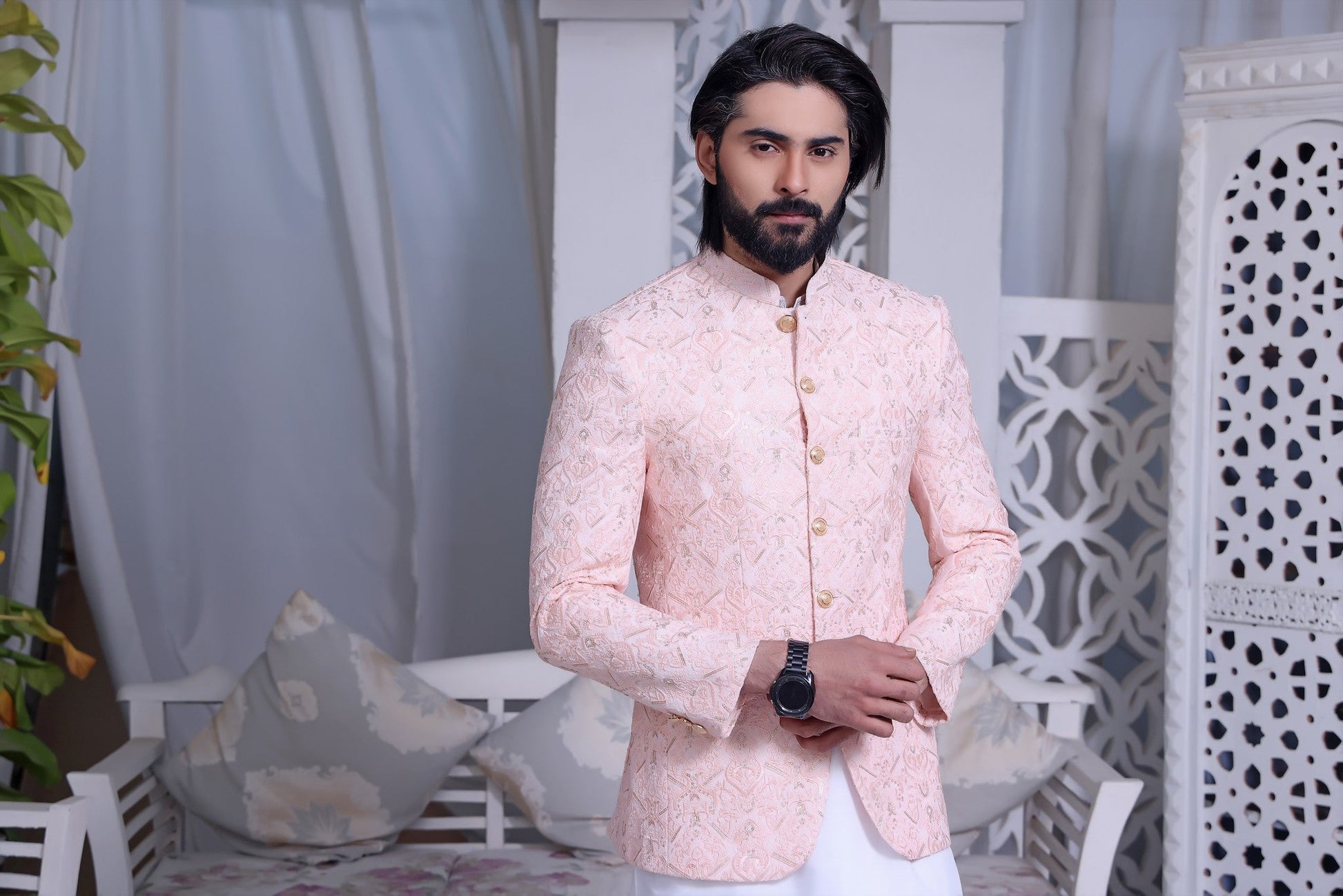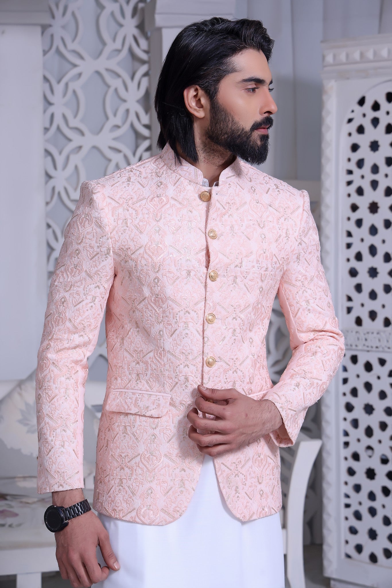 Mens Designer Prince Coat On Raw Silk with Computer Embroidery and Gold Sequence