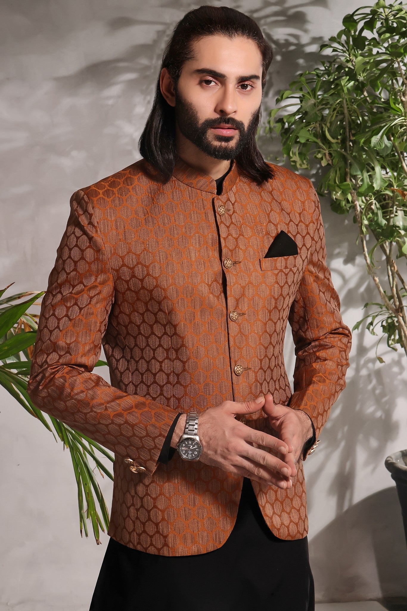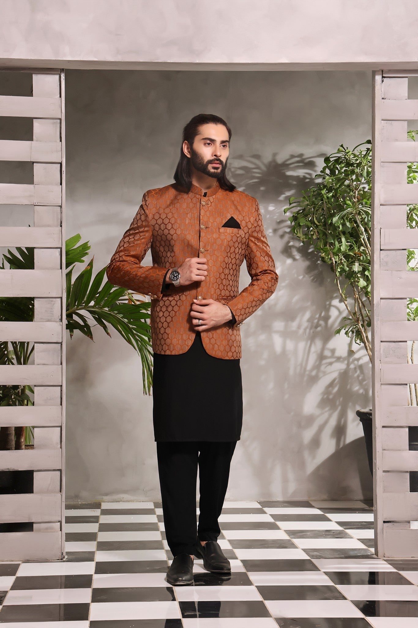 Men's Formal Prince Coat on Jamawar Fabric with Blended Black Kurta Pyjama