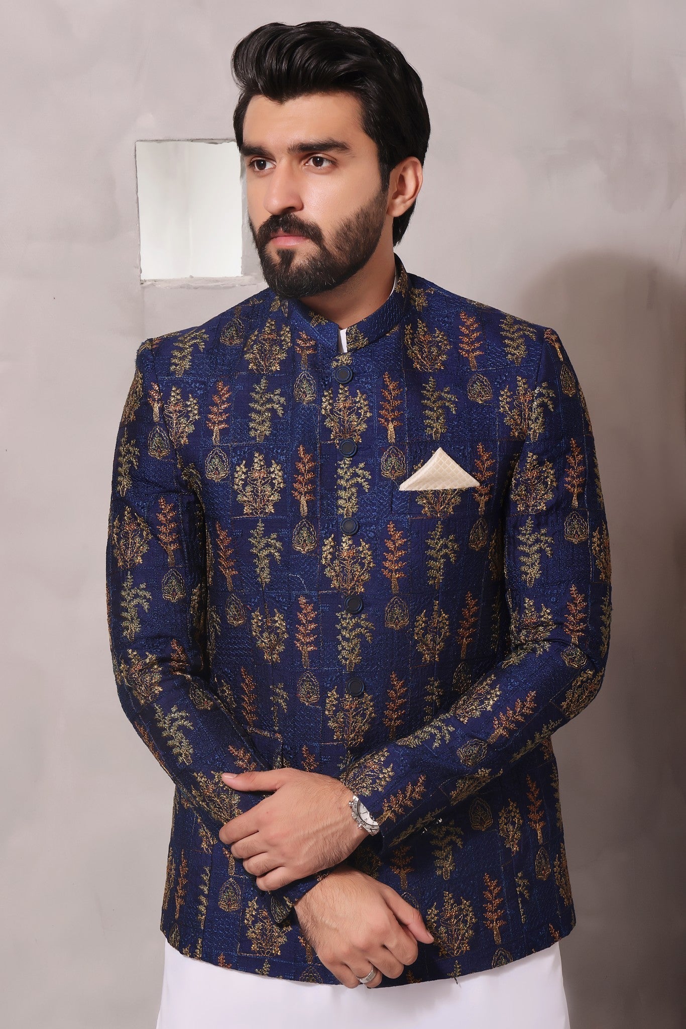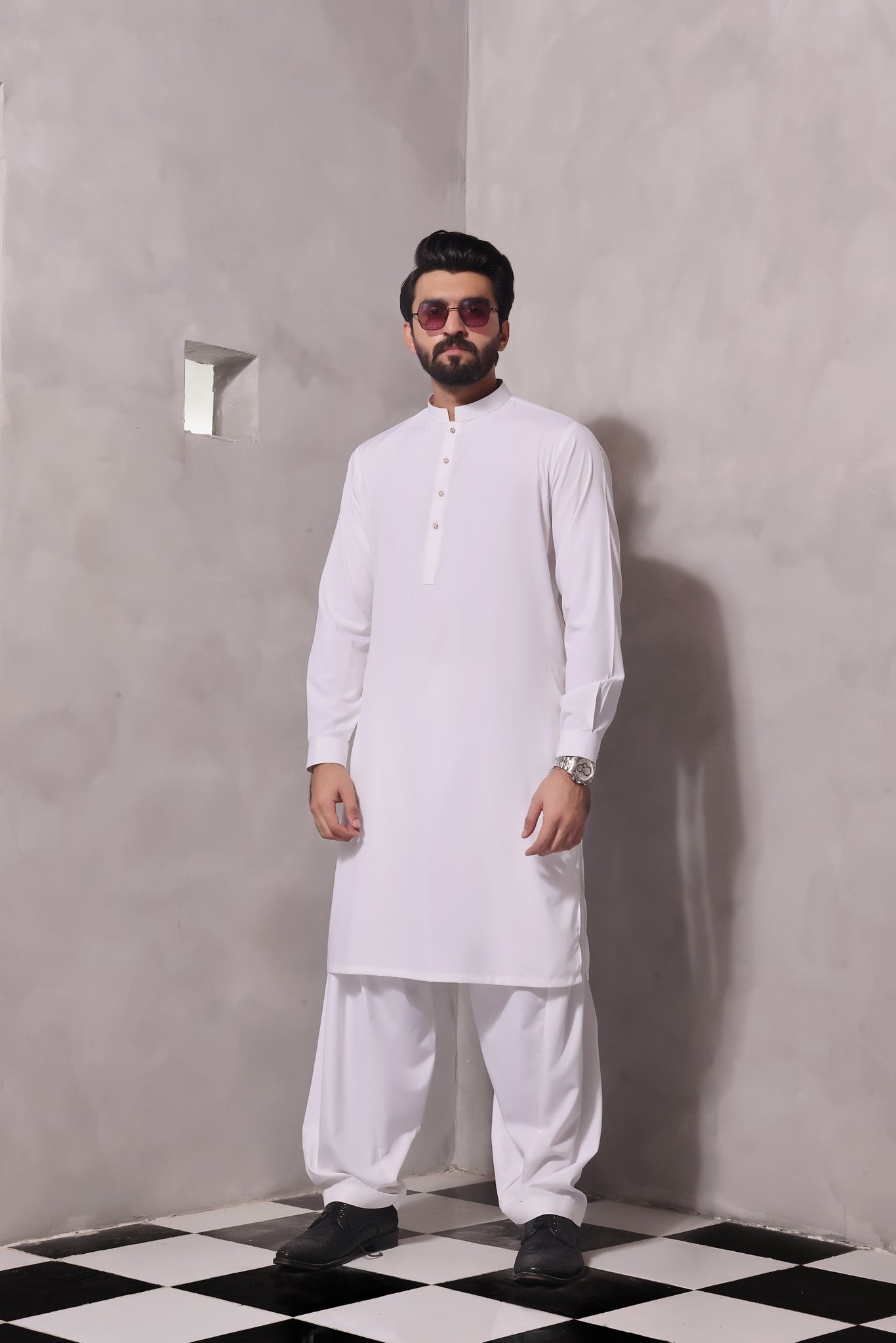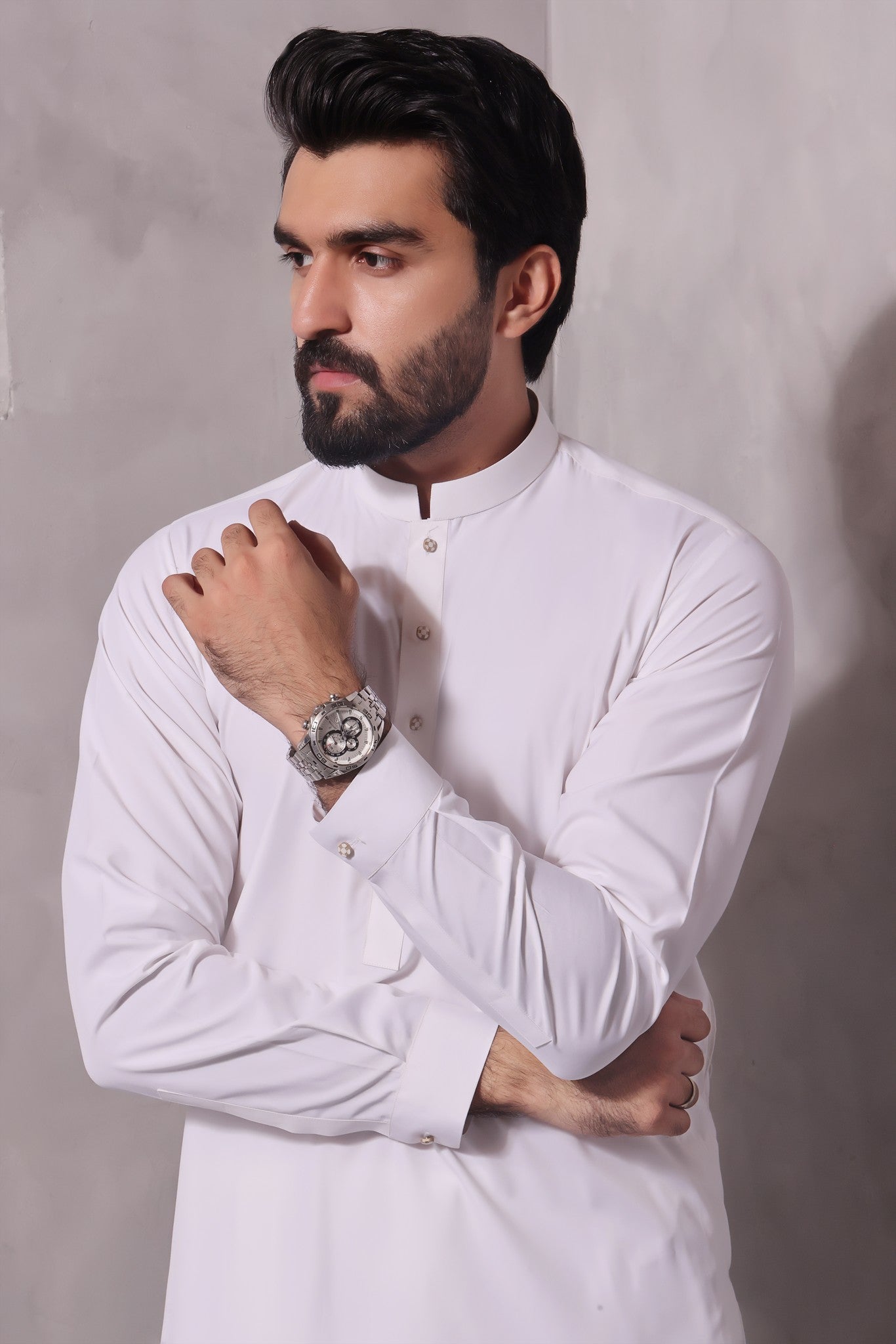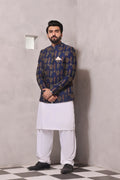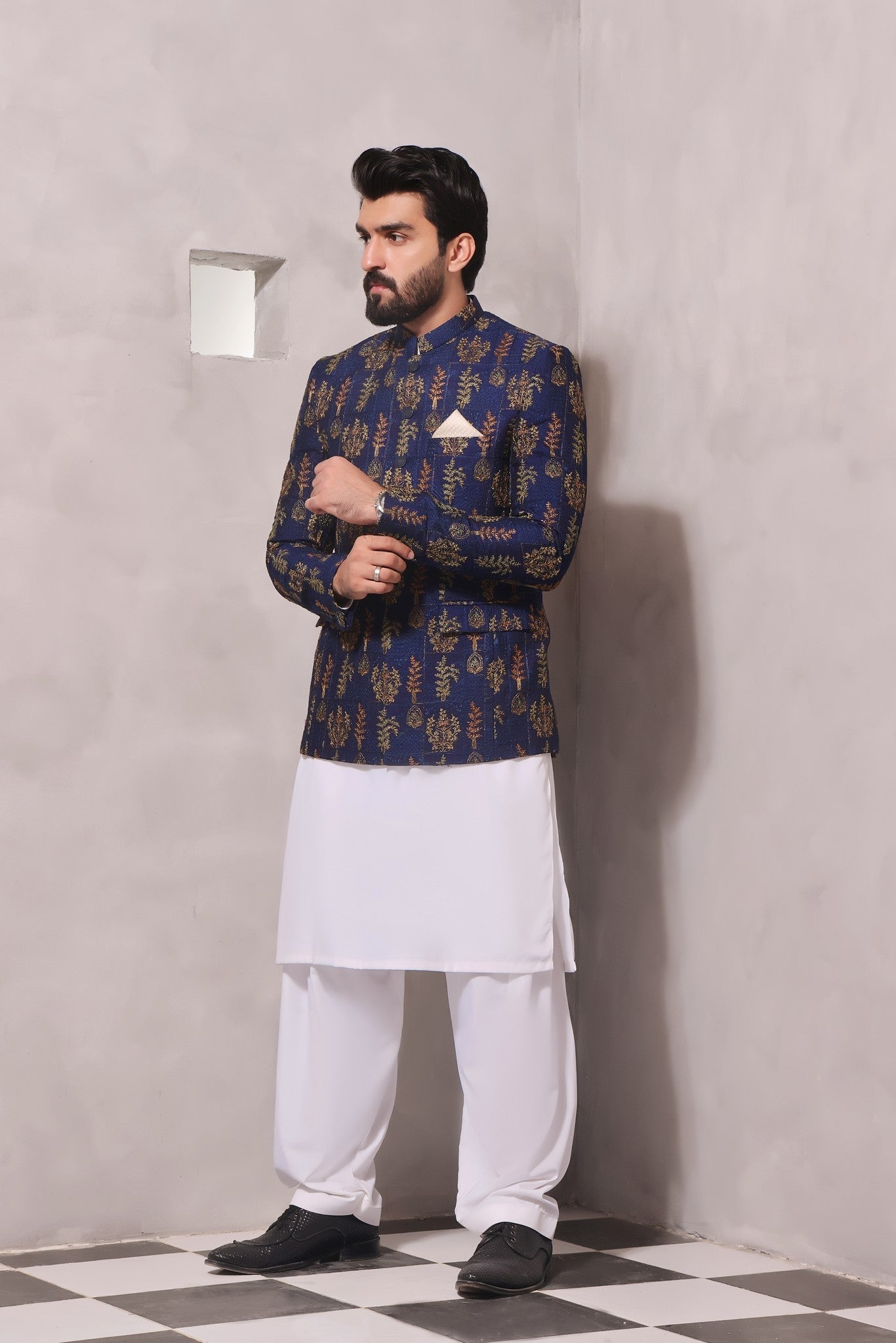 Men's Formal Prince Coat on Raw Silk Fabric with Chikan Embroidery and White Blended Kameez Shalwar