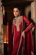 Introducing Royal Crimson – a regal maroon ensemble exuding luxury and sophistication. Featuring a heavy hand-embellished front gala and embroidered organza pallu bunches, this exquisite piece is designed to make you shine with elegance at any grand occasion.