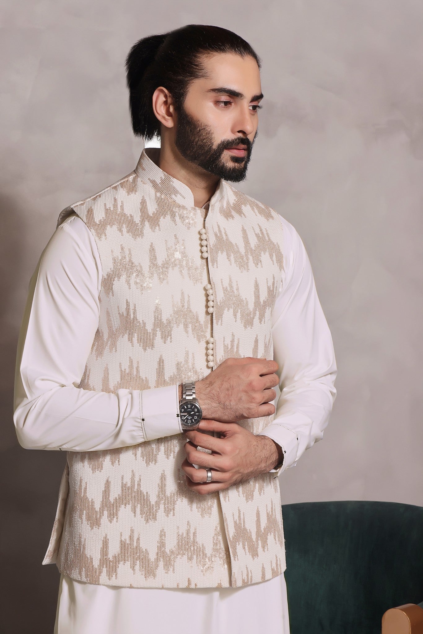 Men's Formal Raw Silk Waistcoat with Sequence and Thread Work