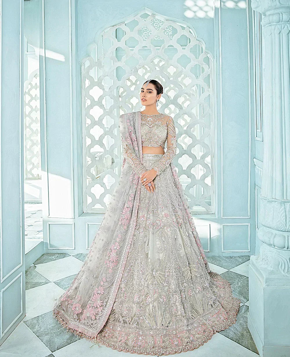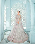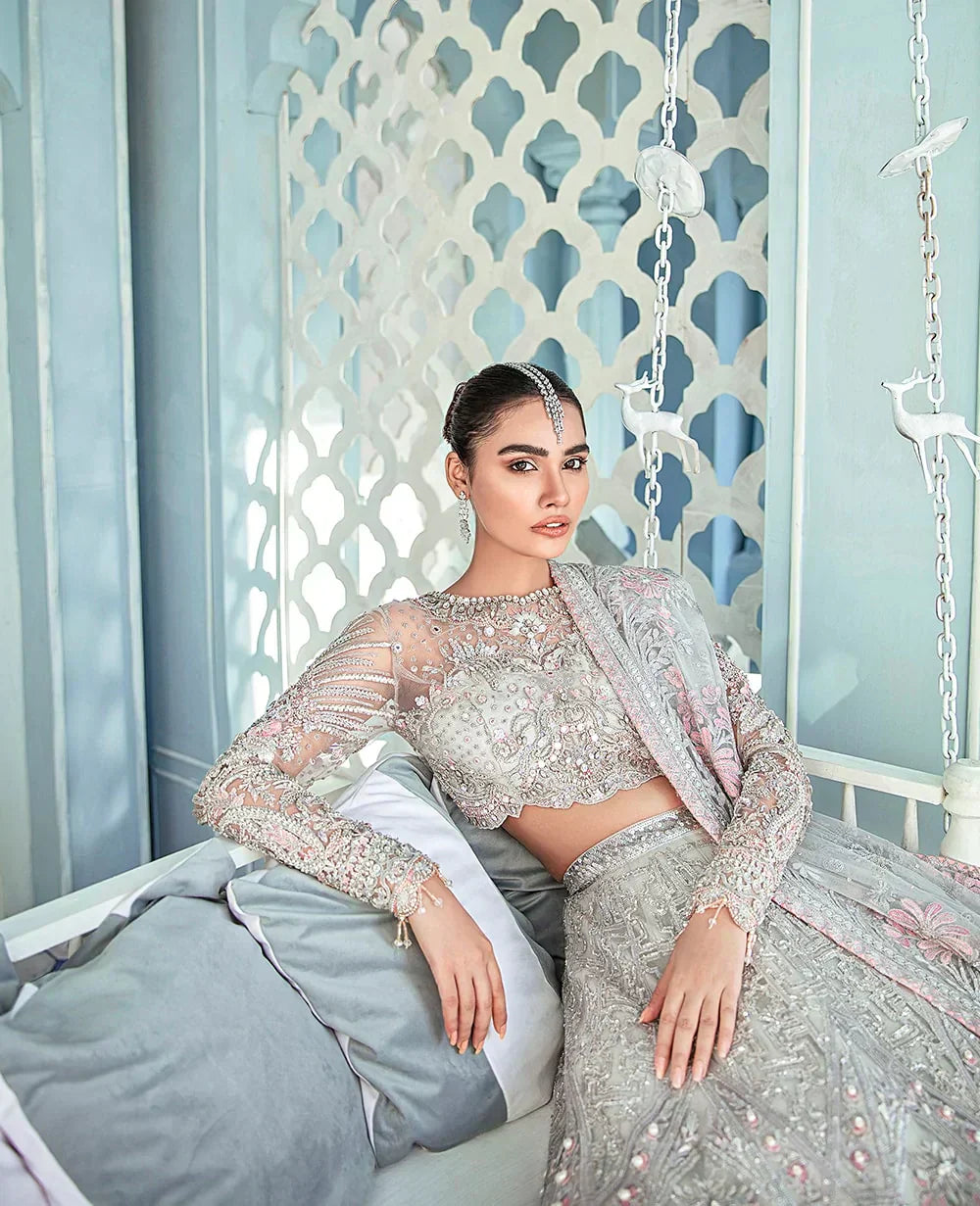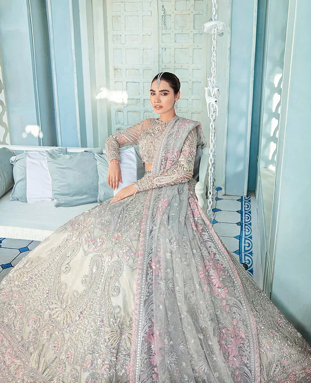 Contemporary yet classical, 'Zilarra' is rendered in hues of grey and silver lehnga choli with powder pink accents. It is excessively and exquisitely hand worked with swarovskis, crystals and pearls, dabka and nakshi. It is paired with grey tulle dupatta finished with silver lappa and tassel details.