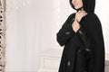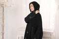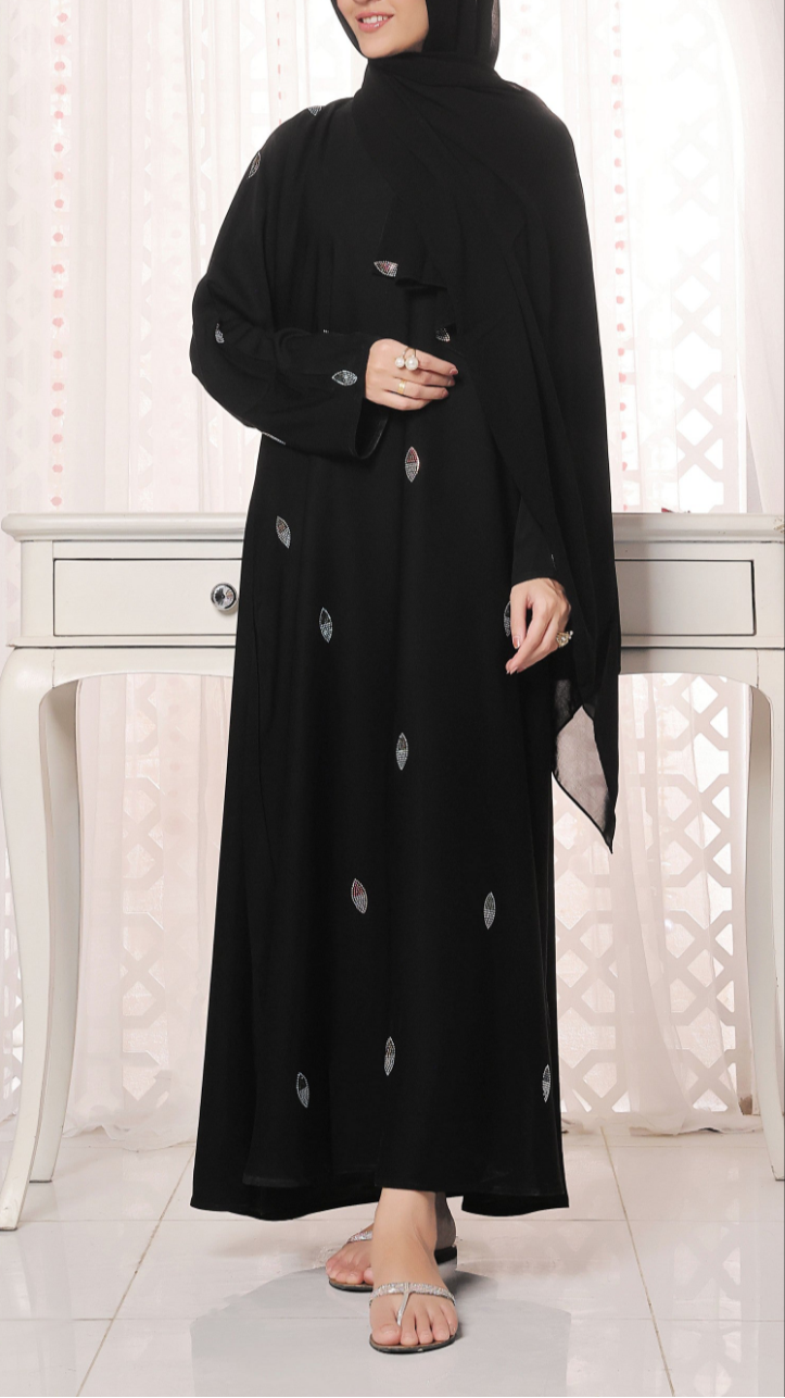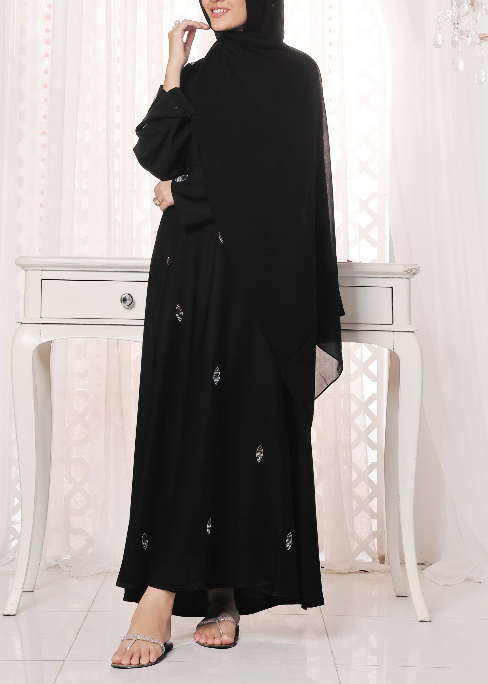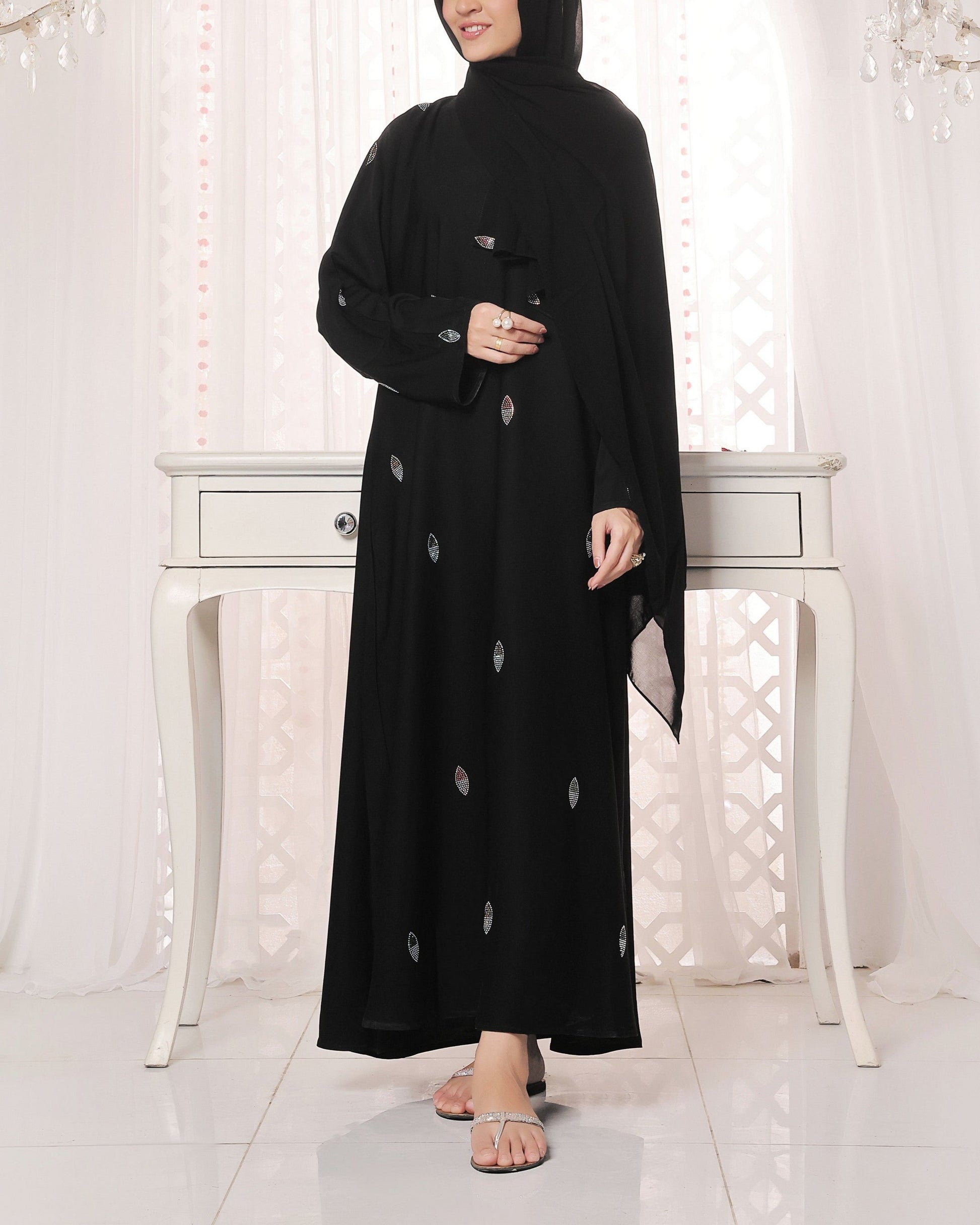 The eye-motif stones add a distinctive edge to this otherwise simple abaya—perfect for those who appreciate refined, minimal details.